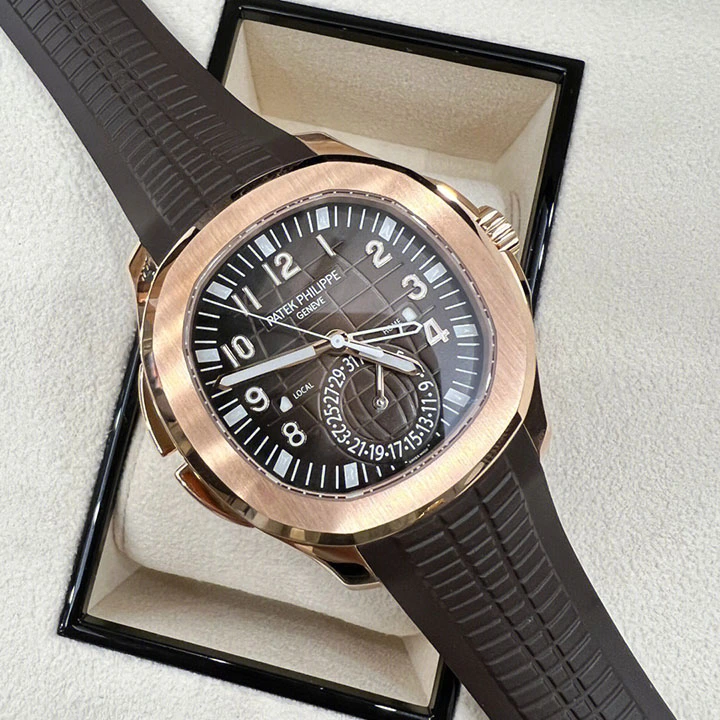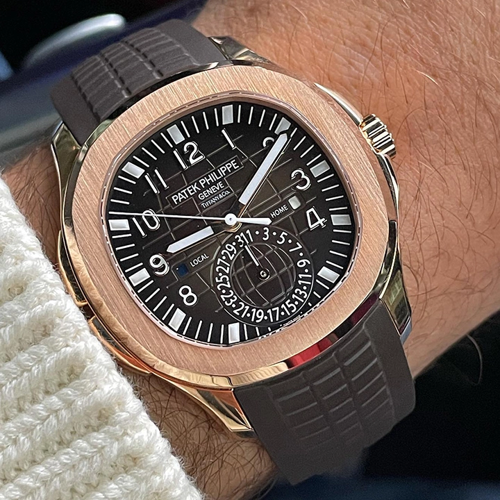 As a sibling to the steel version, the Aquanaut Travel Time is now coming back onstage with the gentle warmth of rose gold and a brown dial. This exceptionally convenient traveler’s companion is endowed with a self-winding movement. The two buttons in the left-hand case flank can be used to move the local-time hour hand forward or backward in one-hour increments. The date is coupled with the local time indication.