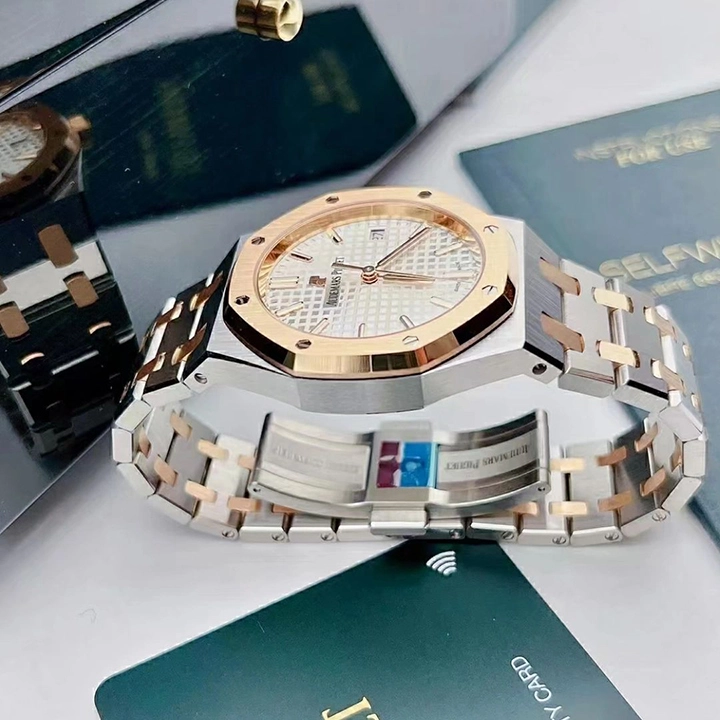 The slender, architectural form of the Royal Oak is outlined in a 37 mm case size and a two-tone material mix: steel and 18-carat pink gold. A pink gold-toned “Grande Tapisserie” dial beautifully underlines the design of this horological icon.